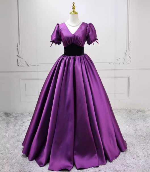 カラードレス パープル Vネック パフスリーブ 細見えシルエット クラシカル 編み上げ 披露宴