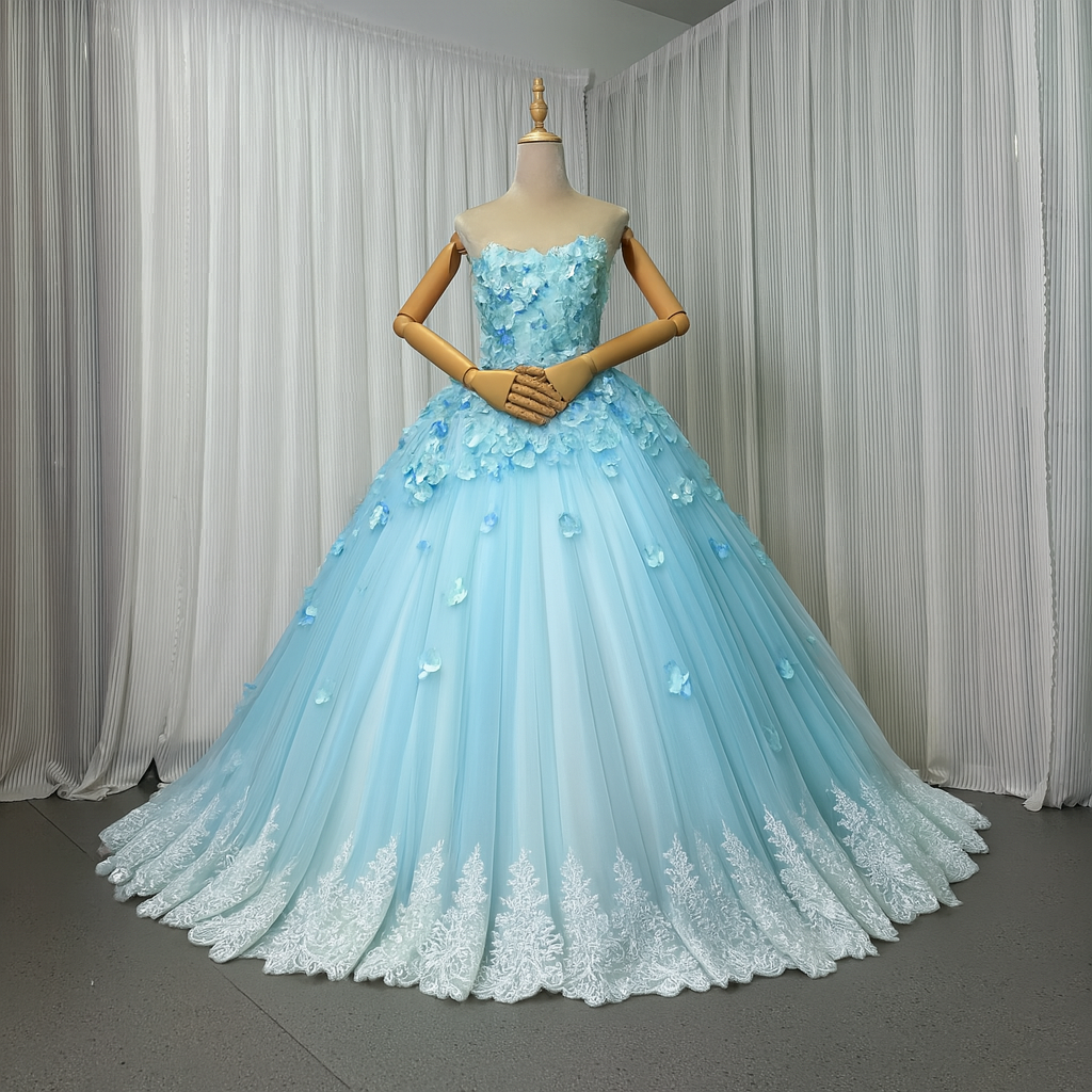 カラードレス ブルー ベアトップ 立体花レース刺繍 リボン 裾に繊細レースをあしらった 編み上げ 花嫁