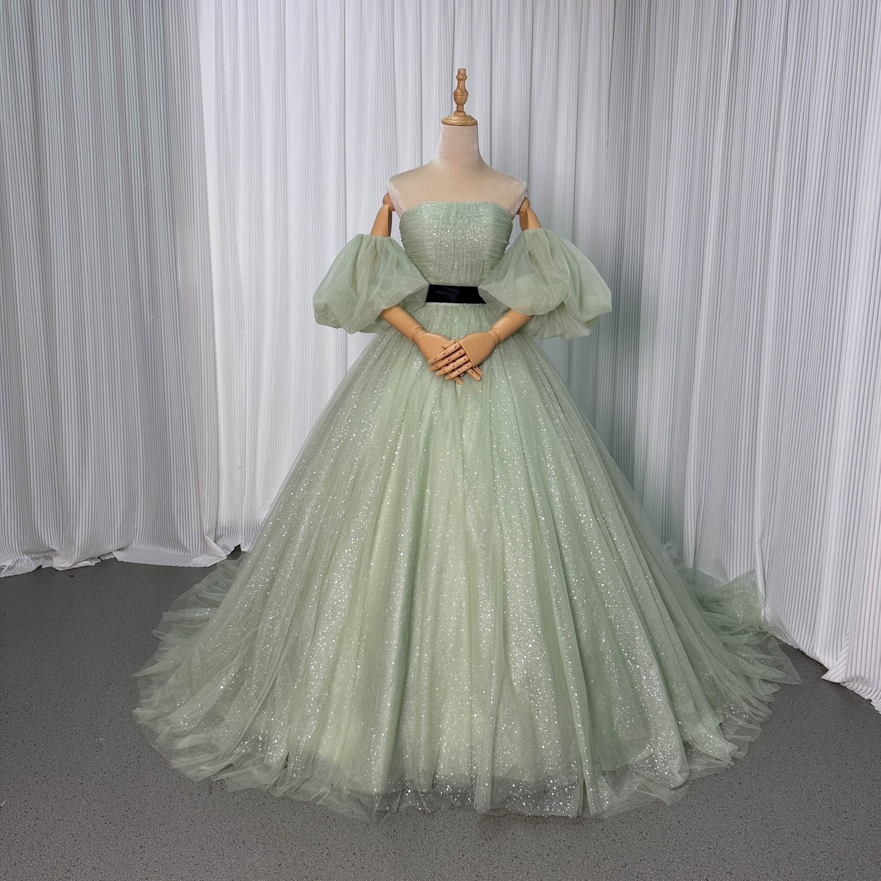 カラードレス ミントグリーン ベアトップ パフスリーブ サッシュベルト シークインチュール ロングトレーン 花嫁