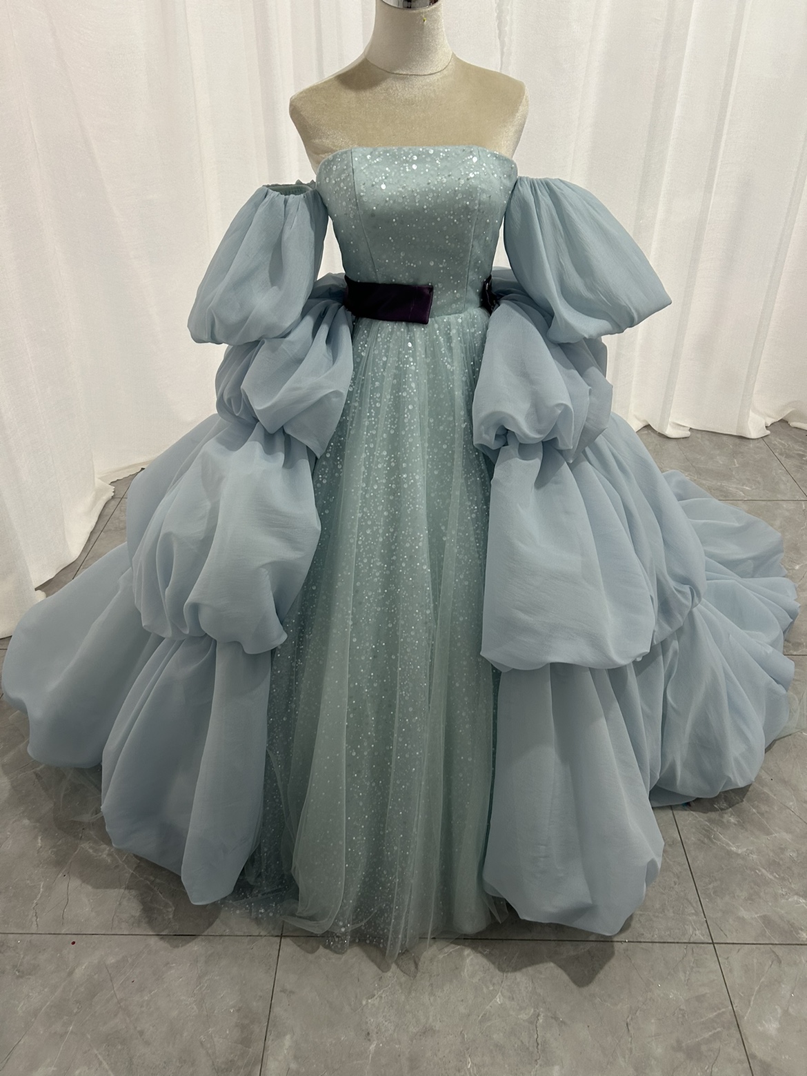 カラードレス ライトブルー ベアトップ キラキラチュール パフスリーブ ふわふわドレス 華やかなトレーン 二次会