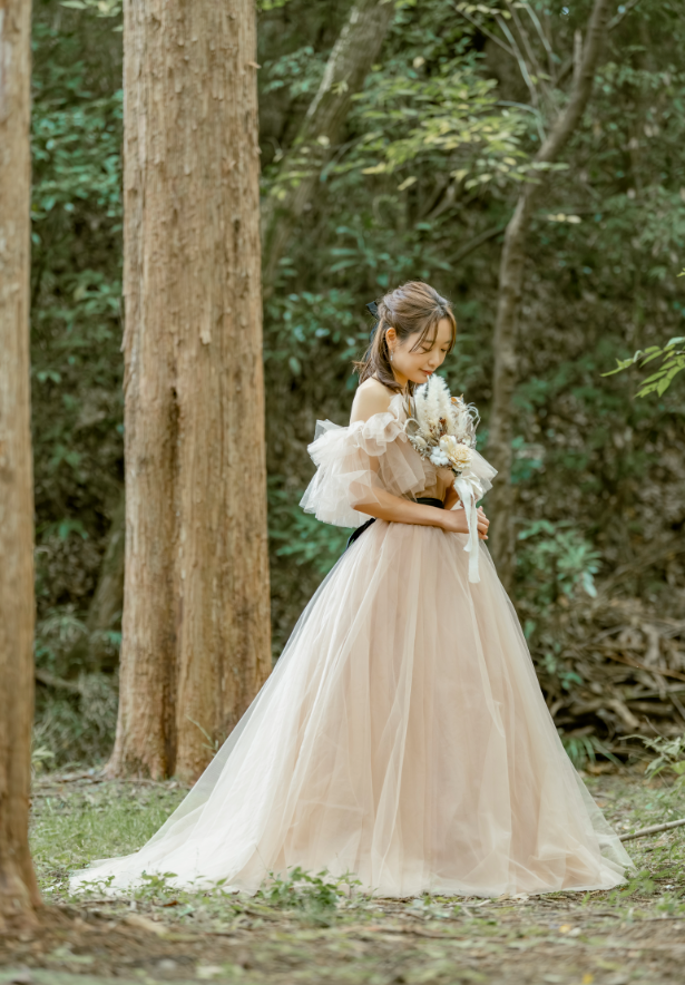 実例写真!カラードレス シャンパン色 オフショルダー チュールスカート サッシュベルト 前撮り 花嫁