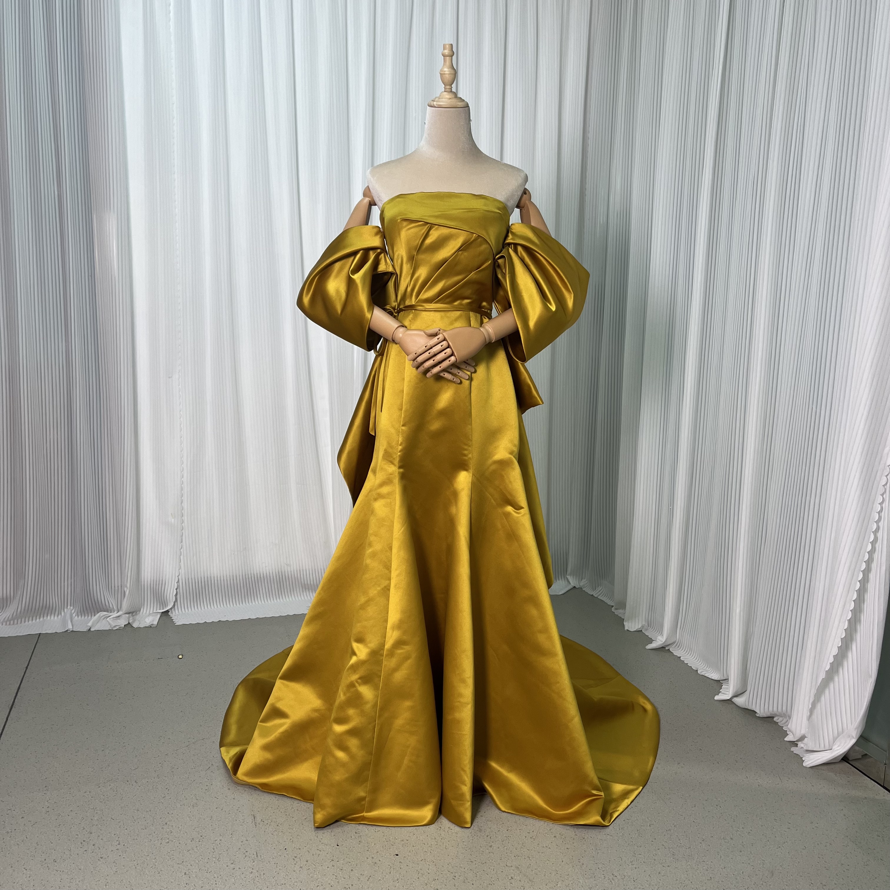 華やか カラードレス イエロー マーメイドライン ベアトップ ドロップショルダー バックリボン ファスナー 前撮り