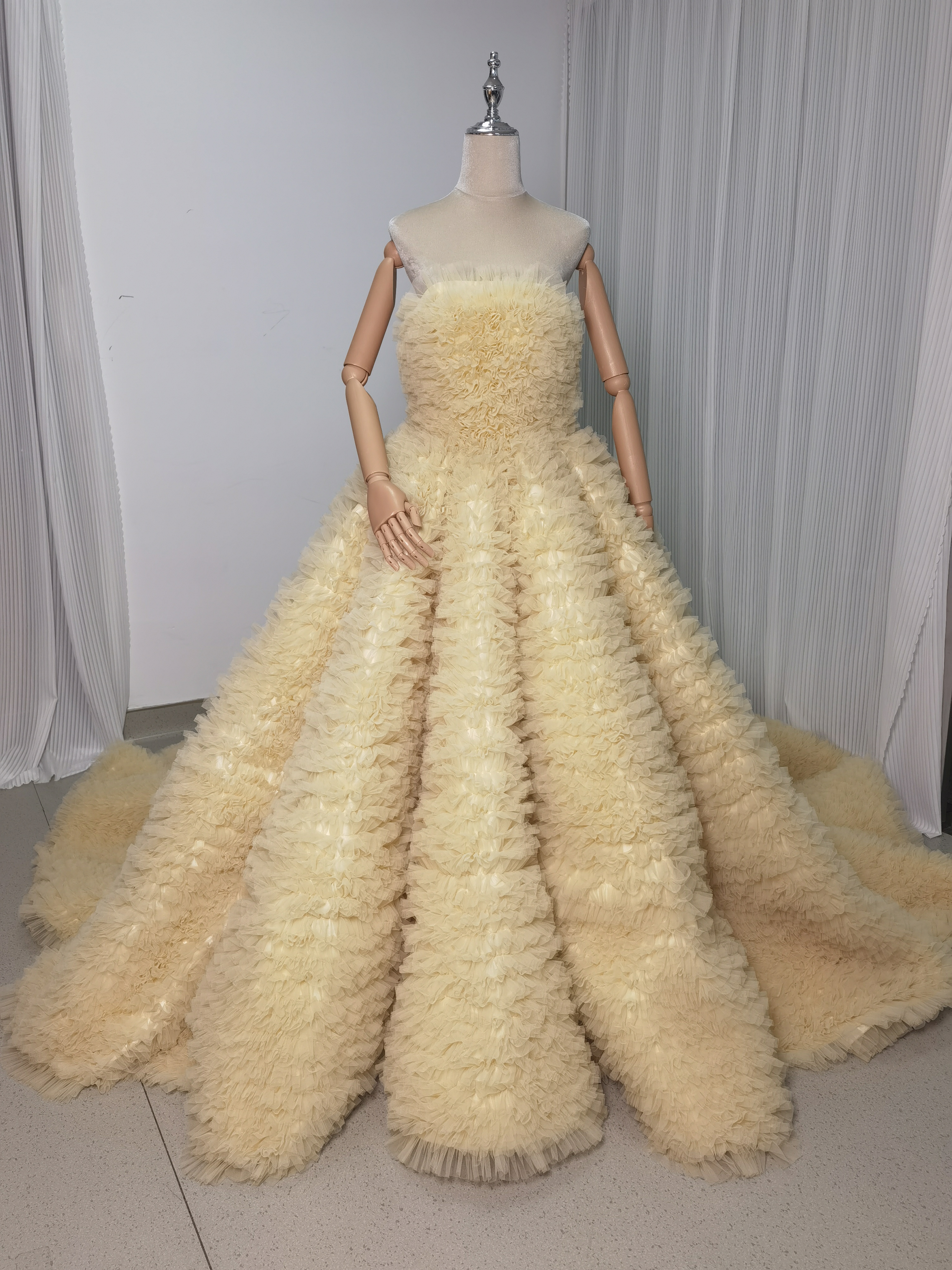 豪華!カラードレス パステルイエロー ベアトップ 柔らかく重ねたチュールスカート ボリュームドレス 結婚式