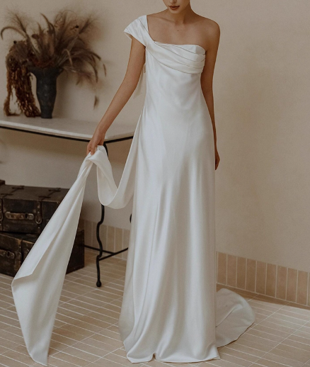 フランス風 ウェディングドレス ワンショルダー 細見えシルエット バックリボン ミニトレーン 2次会/合コン