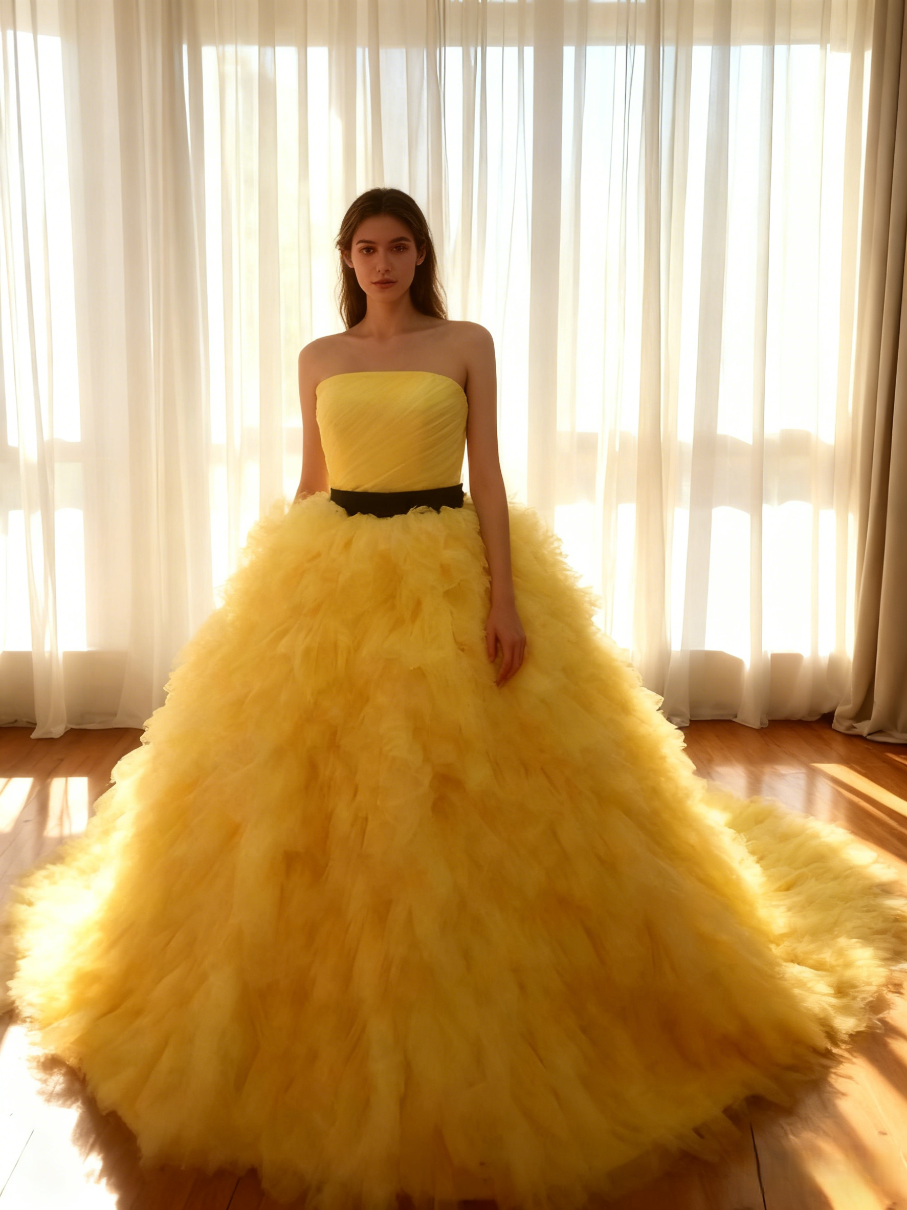 カラードレス パステルイエロー ベアトップ もこもこドレス 抜群のおしゃれ見え ソフトチュール 花嫁